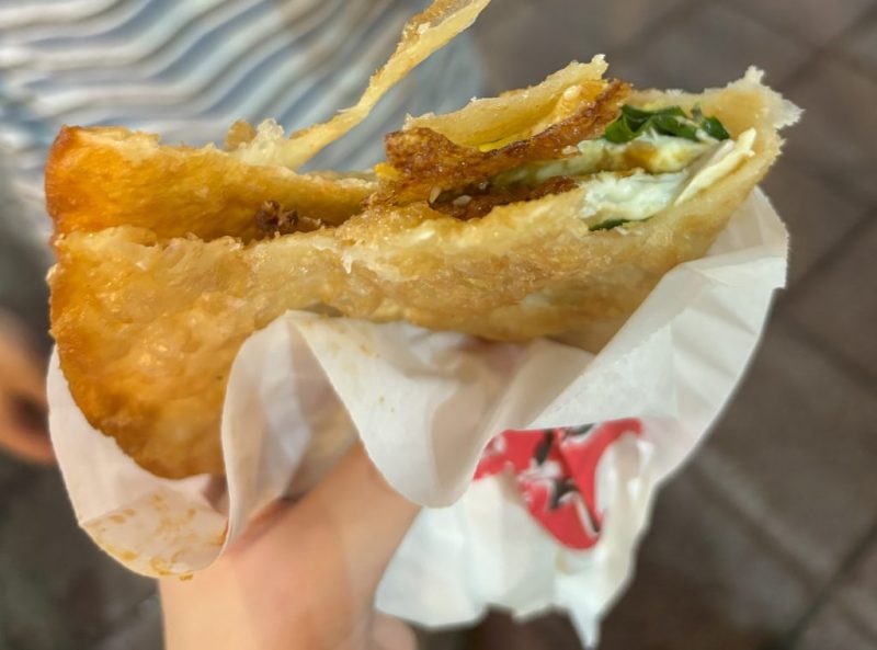 葱油餅(ツォンヨウビン)とは小麦粉の生地にネギを入れて焼いたもの。このお店では油で揚げて作っていて、卵も入っています。