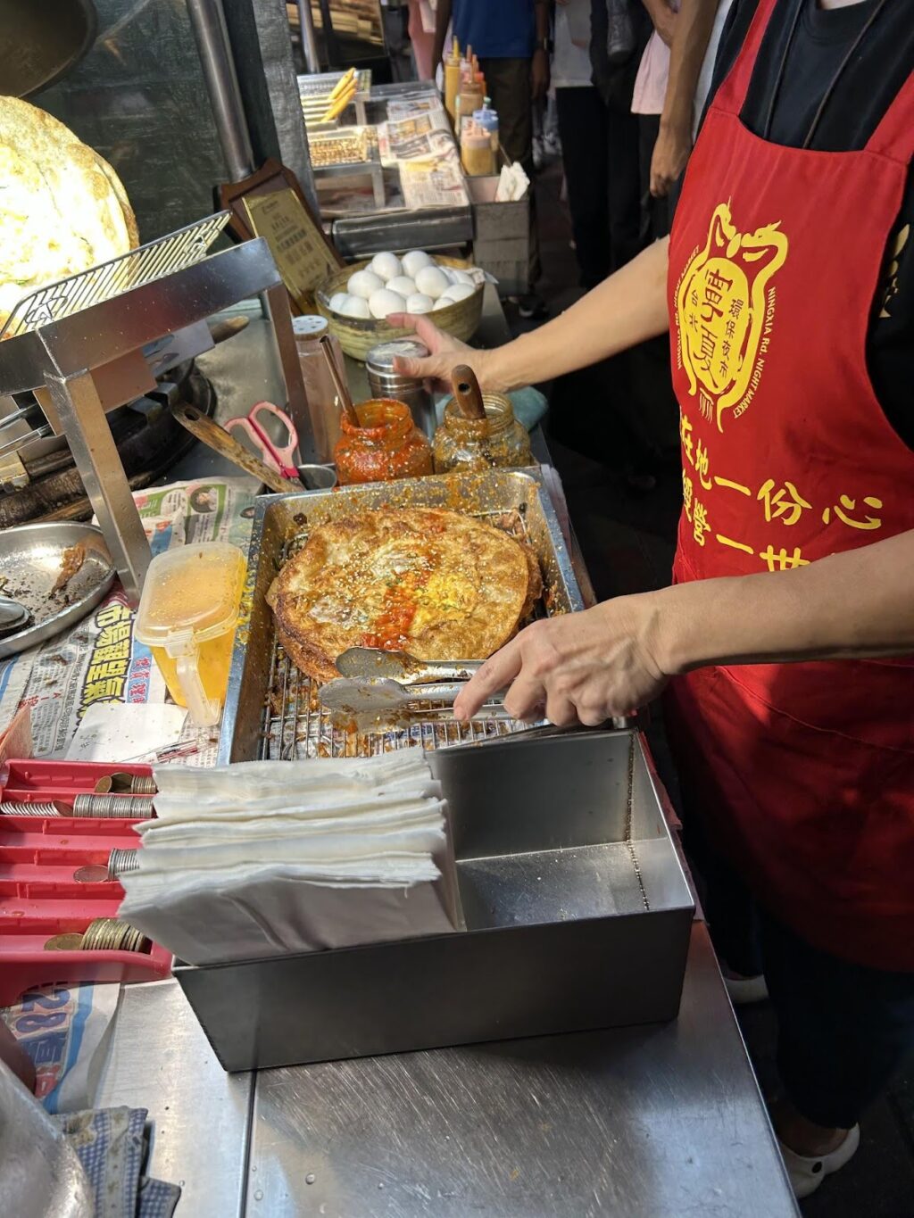 列ができている場合はお店の裏に並び、順番がきたら食べたい個数を伝えます。食べ歩くなら2人でひとつぐらいがちょうどいいかも(結構ボリュームあり)。