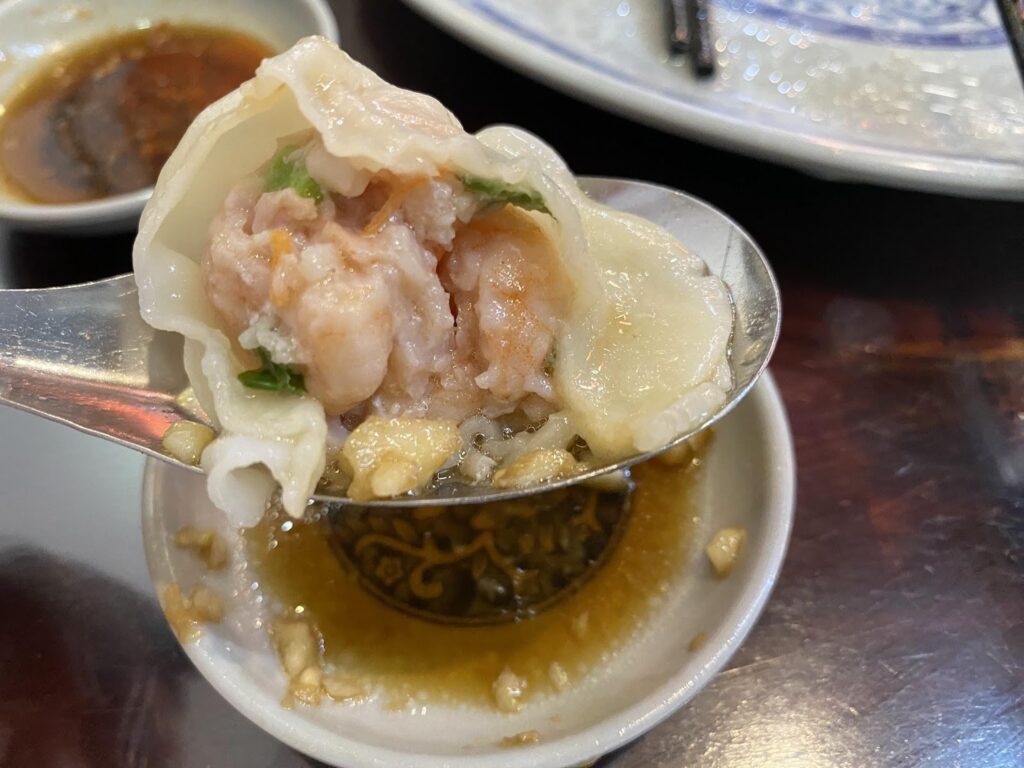 水餃子はエビと豚肉の2種類、あとは個数によって値段が変わります。一皿10粒から一番多いものは20粒、豚のほうがエビより少し安いです。