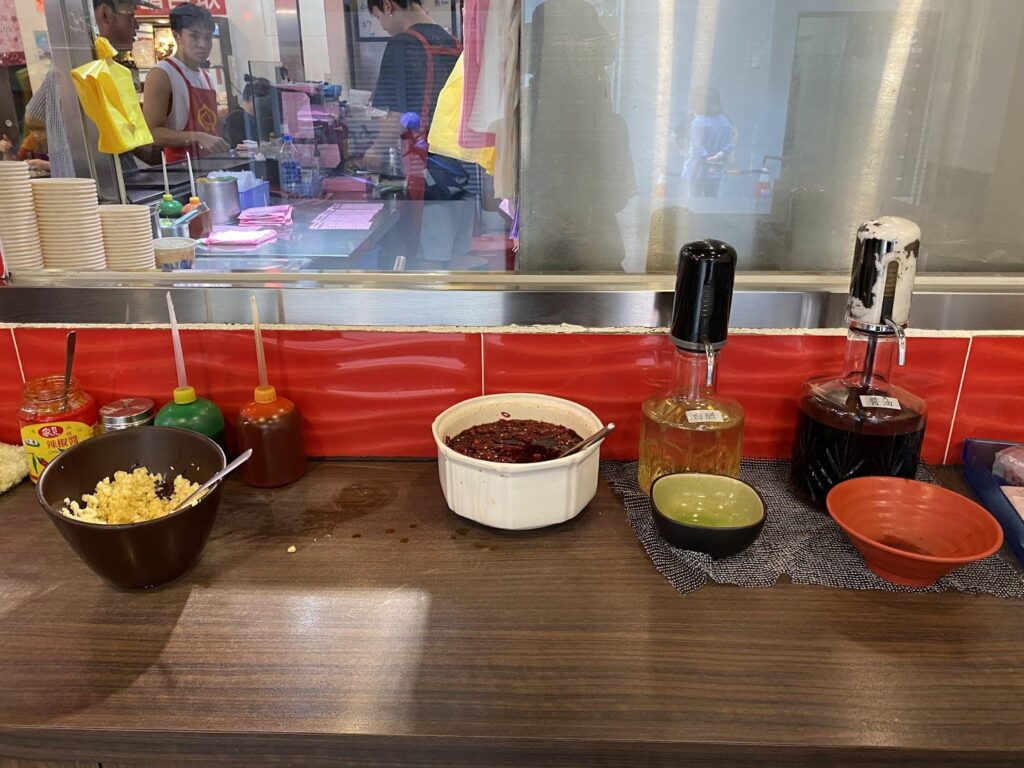 にんにく(たっぷりがおすすめ!)、唐辛子が漬けられた醤油、お酢などをお好みで。辛いのが好きな人は辣醤なども。