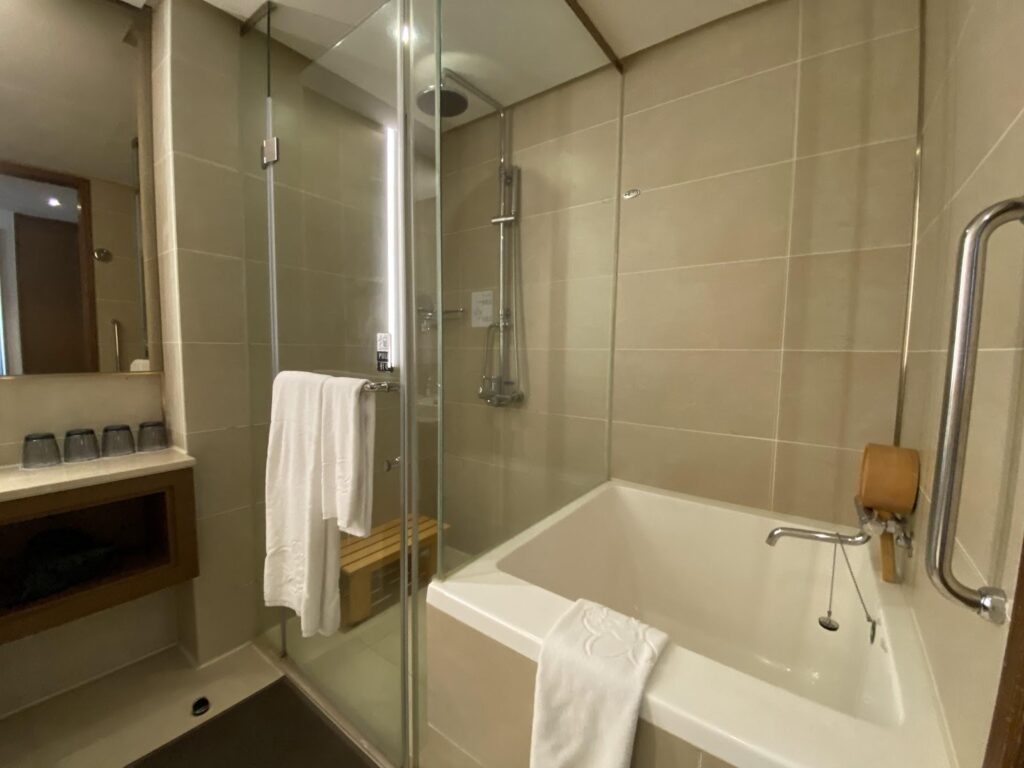 シャワーと浴槽が分かれているので、バスマットを敷いた上を行き来するおもしろい仕様。