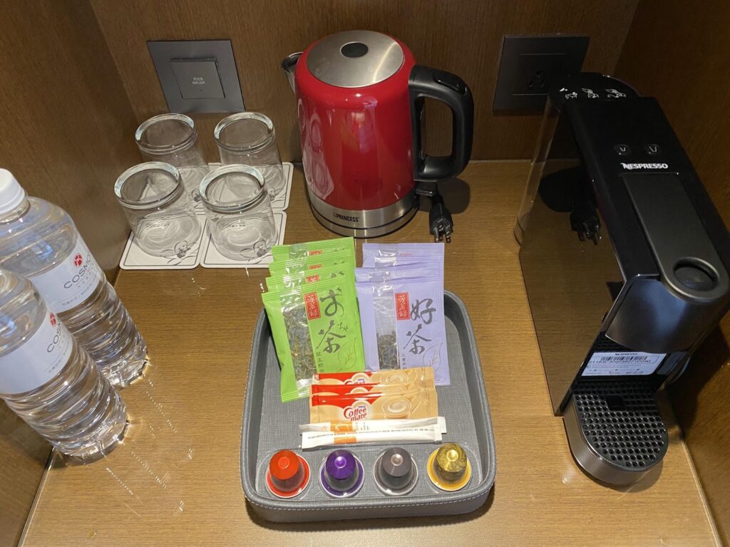 コーヒーメーカーはカプセルで淹れるやつ。お水も毎日補充してくれて、お茶や珈琲もなくなったものは追加してくれました。