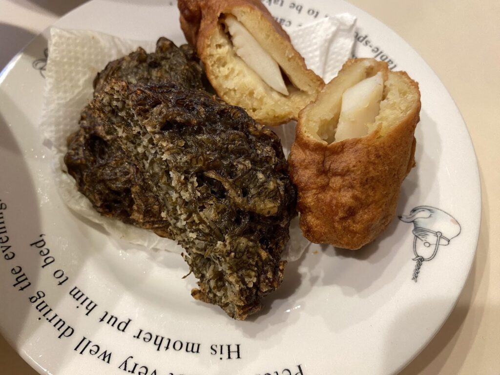 衣がもちもち、ウスターソースをかけて食べる沖縄天ぷら。なかなか食べれることがないから嬉しい!
