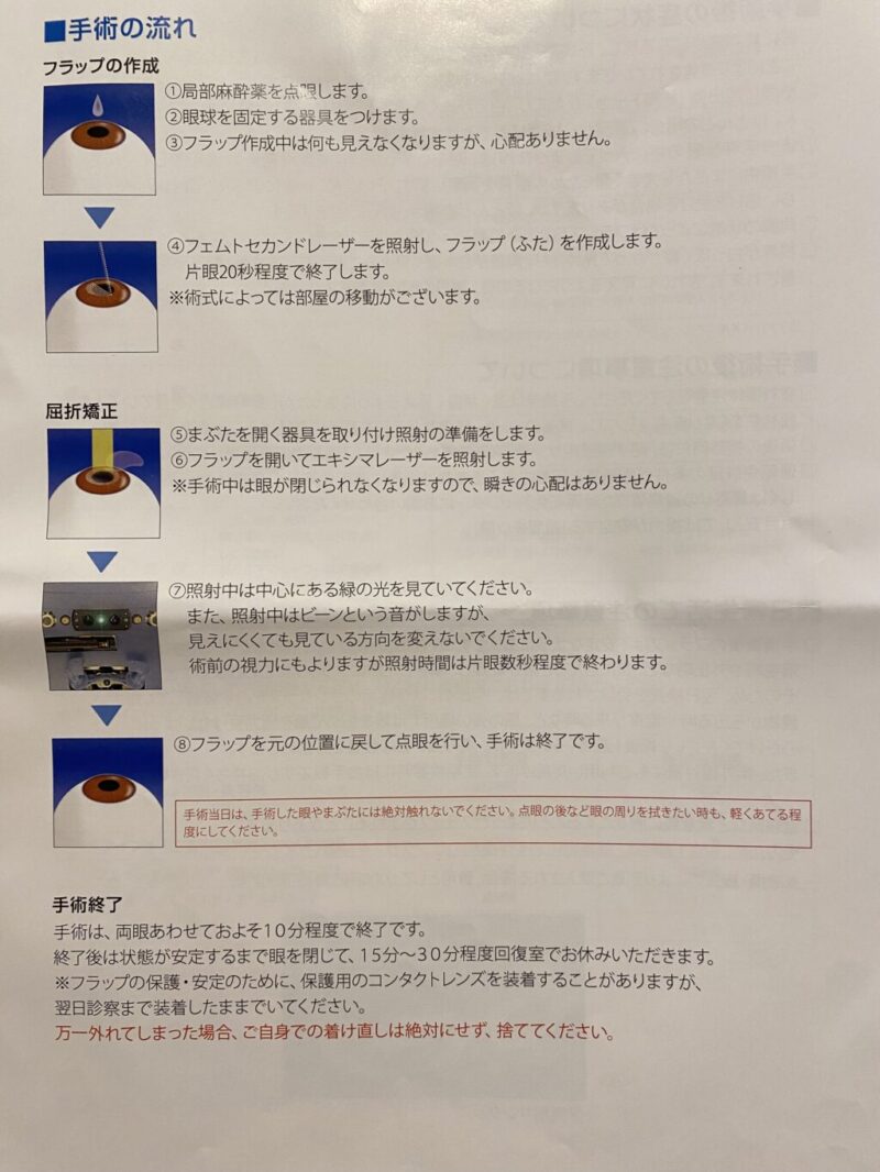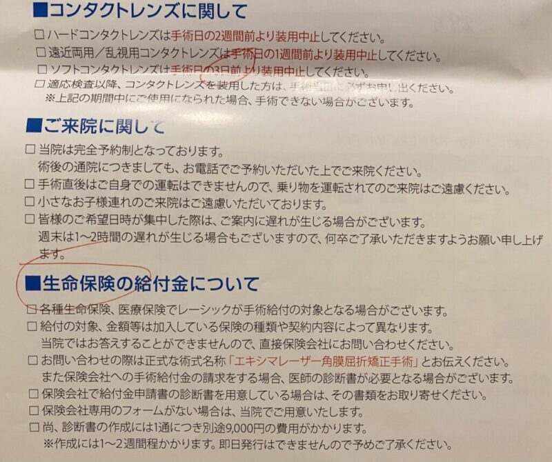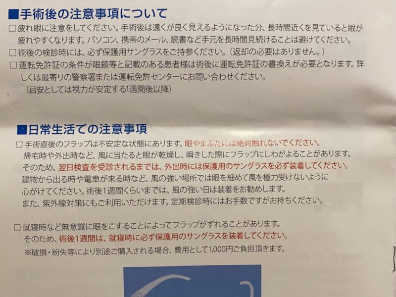 視力に関しても、10年以内に視力が0.9以下まで低下した場合は再矯正の手術を無料で受けられるみたいでとりあえずは安心。(視力が低下しないのが一番ですが!)