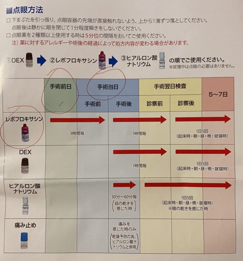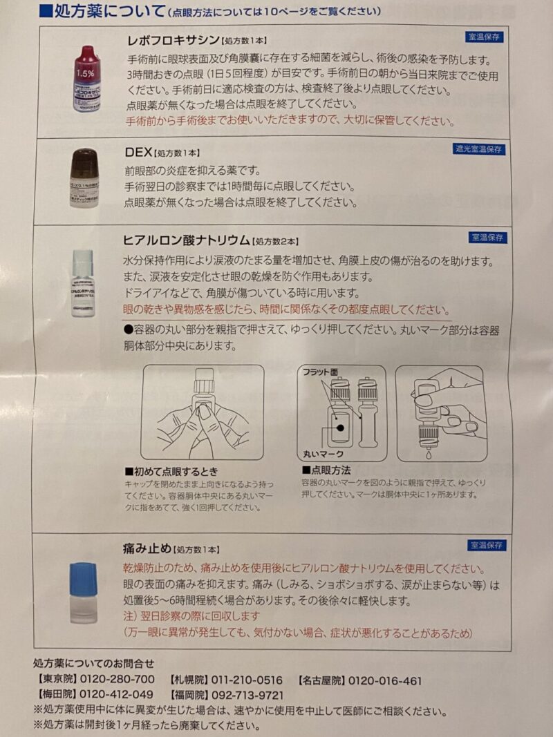 術後は1時間ごとの点眼。3種類を10分以上ずつ置いてさします。さす度にチクチクしみる。術後2時間〜ぐらいからの目の痛みとかがちょっとツラい!痛み止めを3回ぐらい点眼して、市販の鎮痛剤もさっさと飲んだ。でも時間が経つほど視界がクリアになっていく!