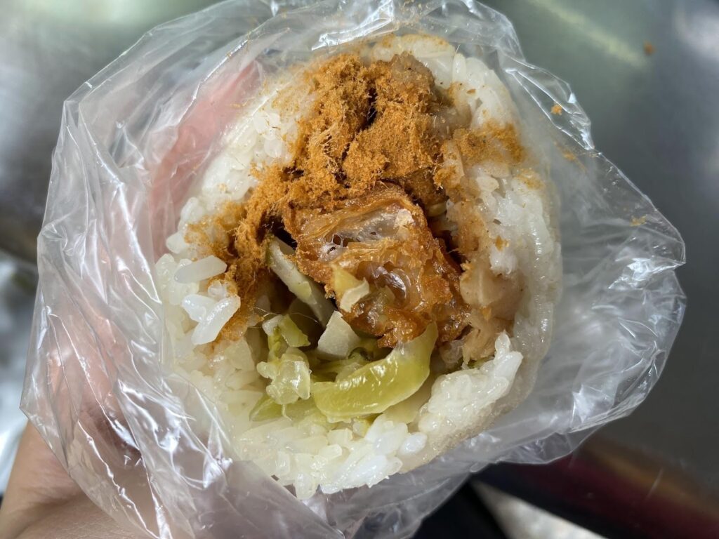 俵の形をした台湾式のおにぎり。肉デンブや高菜、揚げパンなどが入っていて、いろんな美味しさがギュッと詰まっています!