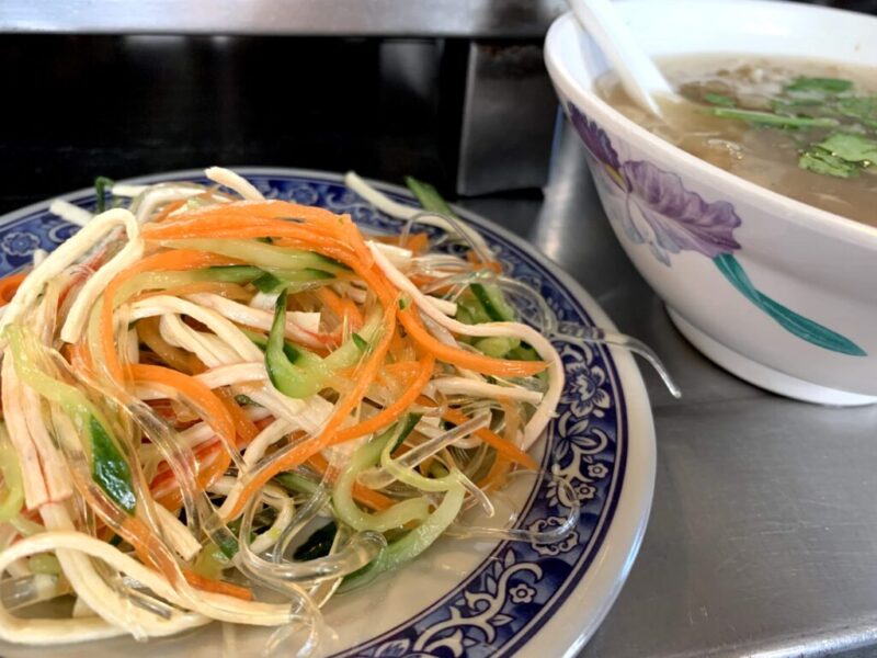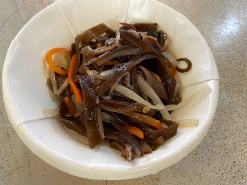 屋台に並んでいるおかず。食べたいものがあれば指さしで注文できます。豆干絲という細切りの干し豆腐を食べたかったのですが、この日はなかったのできくらげともやしの和え物を食べました。これも丁度いい味付けでとっても好き。ちょこっとつまめるサイズです。